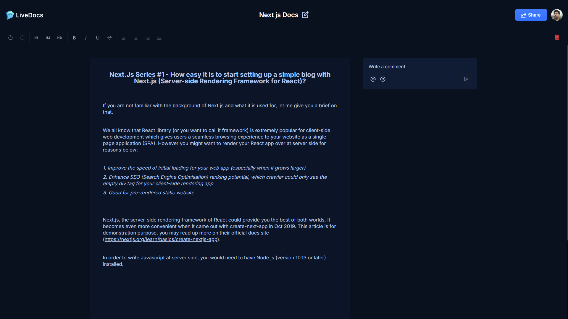 Real-time collaborative document editor built with Next.js, TypeScript, and Tailwind CSS, featuring live editing, comments, and notifications.